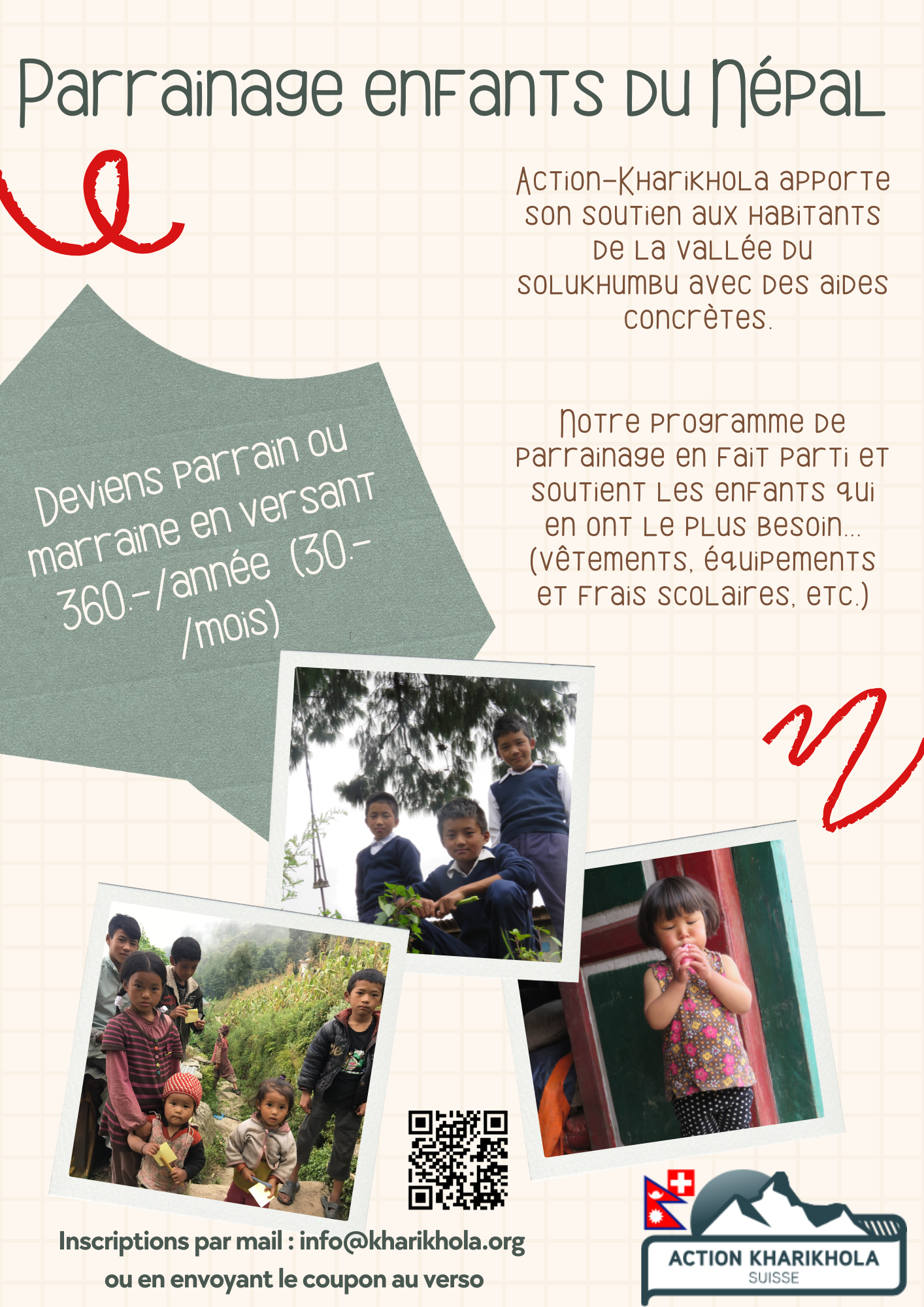L'association s'occupe de parrainer les enfants qui fréquentent l'école de Kharikhola. Ce soutien (CHF 360.-) leur permet de suivre une instruction régulière, d'être nourri et vêtu correctement. Le comité a récemment élaboré une "charte de parrainage" que chaque parrain a reçu et qui résume les conditions pour le soutien d'un enfant.